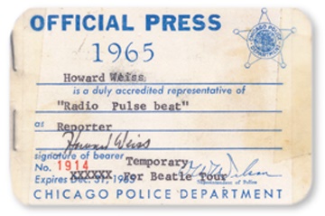 This Chicago Police Dept. official press credential was granted to Howard Weiss, a reporter for "Radio Pulse Beat" News. Ed Rudy "Radio Pulse Beat" interview albums are highly sought by collector's. Reverse has Weiss's social security number, and vital statistics. His identification photo has been removed.
