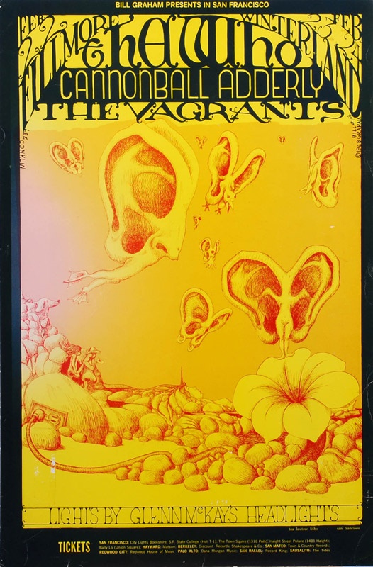 Lee Conklin illustrated this poster, promoting The Who at the Fillmore in 1968, with flying psychedelic ears. Crazy stuff, cool poster. Measuring 14x22", the poster shows some slight edge wear, but is overall EX.