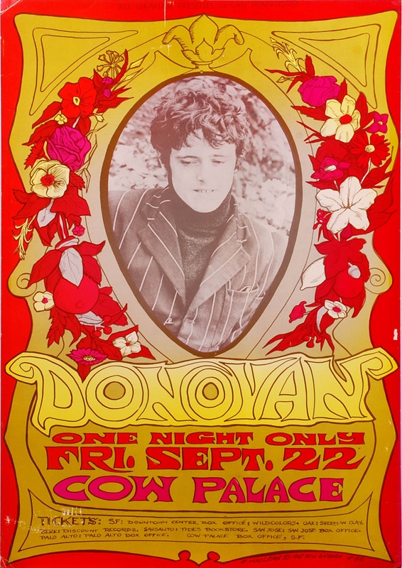 Nice music poster promoting Donovan at San Francisco's Cow Palace in 1969. Photo of Donovan is surrounded by 60's style artwork. Measuring 14x22", the poster shows some slight edge wear, but is overall EX.
