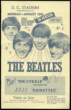 Handbills promoting the Beatles North American concerts are exceedingly rare, since newspaper and radio advertising were the standard mode of promotion for the shows. This example, by far the most appealing of the few known American handbills, promotes their D.C. Stadium appearance of August 15, 1966. Within two weeks of this concert, the group retired from touring. The yellow and translucent green handbill with sharp corners is twice creased across the upper half, with an additional crease across bottom right corner. Less than a half dozen of these are known! From a different vendor.