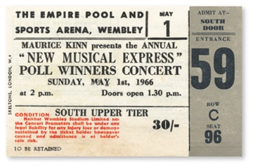 There was no way to know at the time that the holder of this ticket would never have another opportunity to see the Beatles perform live (unless of course, they happened to be one of the privileged few to be present at the famous "Apple Rooftop" performance in 1969). Seating chart and underground/bus routes to Wembley are on reverse. Ex.