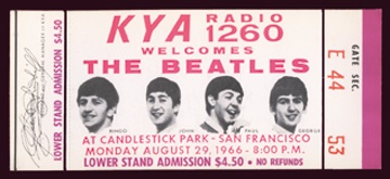 As the last echoes of "Long Tall Sally" reverberated amidst the screaming fans at San Francisco's, Candlestick Park on August 29, 1966, George Harrison was reported to have said as he left the stage, "That's it, I'm not a Beatle anymore." He, of course, was referring to the end of all that was associated with the frenzy that had been "Beatlemania." This memento from that pivotal event in Beatle lore is in flawless Mint condition! From a different vendor.