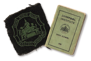 Actual high school yearbook from the Liverpool Institute starring classmates Paul McCartney and George Harrison. Green cardboard covered book sports the shield of the school on the cover. Fifty-six pages in length, it measures 4.5x3". There are no photographs of any of the students, but listed in there are two of the founding members of the Fab Four. "Harrison, G" was born February 25, 1943 and "McCartney, J.P" June 18, 1942. Their "Form" (education), "Year of Entry", and "House" are all listed as well. Best mates and lifetime "Fifth Beatles" Mal Evans & Neil Aspinall are in there as well. There is writing on the front and back covers and the binding is weak. However, this is a great rock rarity and so early. Comes with a blazer patch with the school logo, which is from the classmate from whom the yearbook was purchased. George and Paul wore exactly the same one.
