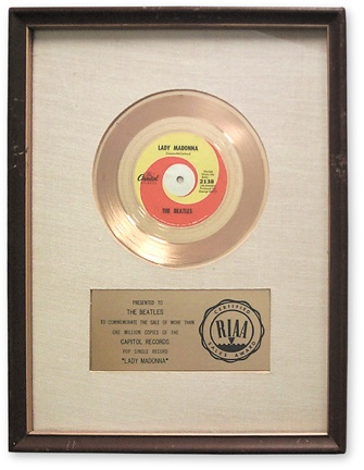 The engraved plaque on this highly desirable record award reads, "Presented To The Beatles To Commemorate The Sale Of More Than One Million Copies Of The Capitol Records Pop Single Record Lady Madonna." Released on 3/23/68, the group's final single on the familiar yellow and swirl Capitol label was certified gold by the RIAA (Recording Industry Association Of America) a mere two weeks later on 4/8/68. The familiar Granny Smith apple would grace the label of the very next Beatle's release, "Hey Jude." This award is in exceptionally fine condition with the exception of a crease that appears in the lower left area of the small-holed label. It was re-glued to the disc in 1997. At that time a crack in the lower left corner of the glass necessitated replacement. A slight bit of tarnish on the disc itself was chemically treated as well. Very few Beatles awards displaying the small-holed label have ever appeared in the marketplace. This is your chance to own a lasting remnant from a pivotal year in the careers of the largest selling and most influential artists in rock history!
