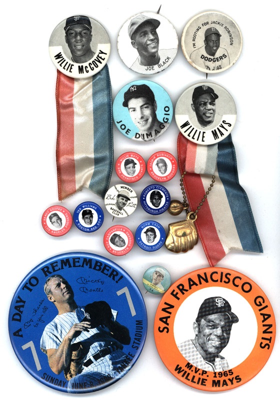 Williams pin; 1 ?" Joe DiMaggio Fantasy pin; and 1980's 1" Babe Ruth