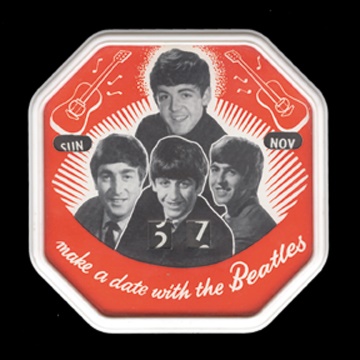 This eight sided 5" plastic calendar comes from the United Kingdom. Interchangeable dates and easel back complete this elusive Beatles collectible. NRMT.