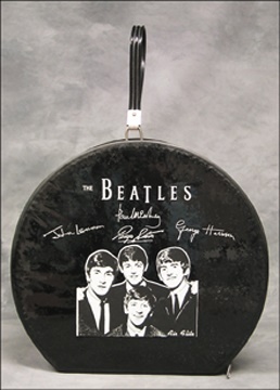 A shiny patent leather girl's zippered overnight bag held all a Beatle fan needed for a slumber party. Some consider it a hat box. It originally was sold in black or red. VG+.