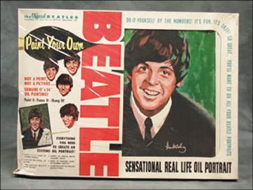 "Sensational Real Life Oil Portrait" of Paul is the Official Oil Paint Set created by Artistic Creations. This extremely rare boxed set is still sealed and measures 18x14". This set features 11x14" ready to paint picture. Corner stained spot; corner and top left side crushing. Originally retailed for $3.99. Now one of the top few dozen rarest and most desirable Beatles toys.