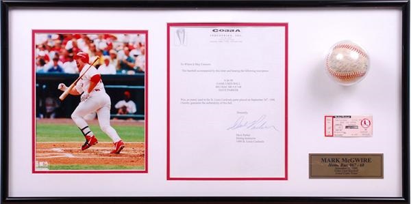 Very nice framed display piece that features a game used baseball from 9-26-98; the game Mark McGwire hit home runs #67 and 68. The official National League (Coleman) baseball is signed by Cardinals' hitting instructor Dave Parker with the inscription, "9-26-98 Game Used Ball Big Mac HR #67-68 Dave Parker". The ball is framed alongside an 8x10 photo of McGwire at the plate, an LOA from Dave Parker confirming the ball's origins and a ticket stub from the game. Measures 14x28"