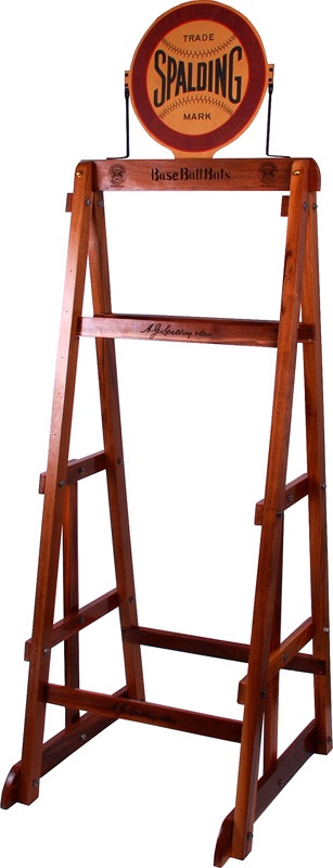 Identical to the Spalding bat racks that used to be displayed in Sporting Goods stores early in the 20th century. It stands nearly 6.5 feet tall and about 2 feet wide with a fantastic metal Spalding sign attached to the top. This oak bat rack will display 26 of your most prized bats atop shiny brass hooks (not installed in the photo) making it the most perfect presentation piece. Will be shipped unassembled.