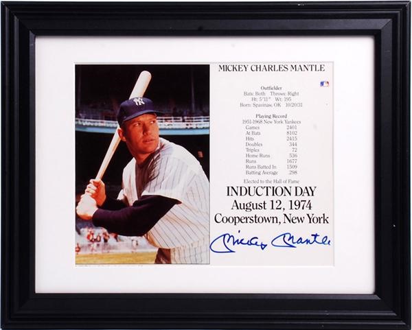 8 x 10'' print picturing Mantle and giving his Hall of Fame Induction stats. Signed in Mint Blue Sharpie. Framed. LOA JSA