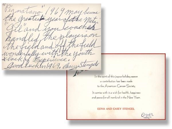 Christmas Card sent from Mets former manager Casey Stengel to Joe Pignatano reads "Pignatano, 1969 may become the greatest year of the Mets. Gil and you coaches handled the players on the field and of the field wonderfully with the youth and lack of experience. Good luck in 1969- Casey Stengel." LOA signed by Pignatano.