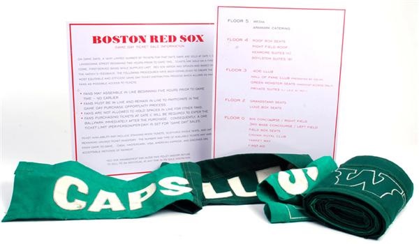 Three pieces of signage that hung at Boston's Fenway Park. Includes 11 x 16'' stadium floor directory, 14.5 x 14.5'' ticket sales sign and about 6 foot long banner for souvenir sales. EX-MT
