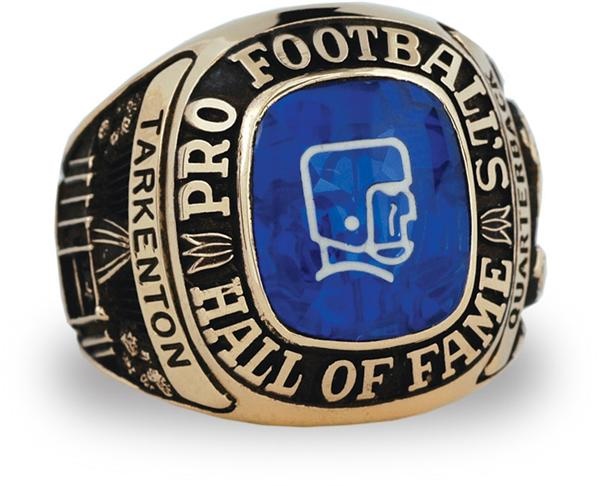 Identical to the ring that the Hall of Famers get, this was not Fran Tarkenton's ring but identical to the one that he received. On top is Football Hall of Fame etched in a blue stone surrounded by the words "Pro Football Hall of Fame." One shank has "Tarkenton" with a likeness of the Hall of Fame below. Other shank has "Quarterback" with "Elected 1986" below. Stamped "Balfour 10K" inside. Also has small number "2" stamped inside probably to signify that this was the 2nd ring of "Tarkenton" produced. Size 12. NRMT.