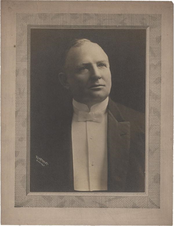 Cap Anson was a professional baseball player for the National Association and Major League Baseball. He played in a record twenty-seven consecutive seasons. Cap Anson is dressed in a tux for the picture. "Rembrandt Chicago" is on the lower left corner of photo. Photo mounted to cardboard with printed frame around photo. Cardboard slightly torn in left upper corner and worn with age but holds photo well. Faint stripe across the lower portion of his face on the photo but it is barely visible, and doesn't detract from the overall quality of the photo. Looks great and is in excellent condition.