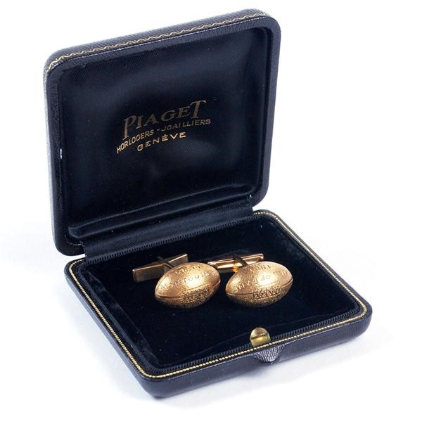 These 14 karat gold cufflinks were awarded to Montgomery for his 1963 induction into the College Football Hall of Fame. Both are in the shape of footballs and are engraved "Cliff Montgomery Hall of Fame 1963." Cliff Montgomery was the captain of the Columbia University Lions football team that won the 1934 Rose Bowl. Montgomery threw the pass, a trick play known as the KF-79, which led to Columbia's 7-0 upset over Stanford University. He was named the game's MVP. After college, Montgomery served in the US Navy during World War II. He earned the Silver Star during the1945 invasion of Okinawa and was credited with saving over 400 lives by navigating his flagship alongside a burning destroyer.