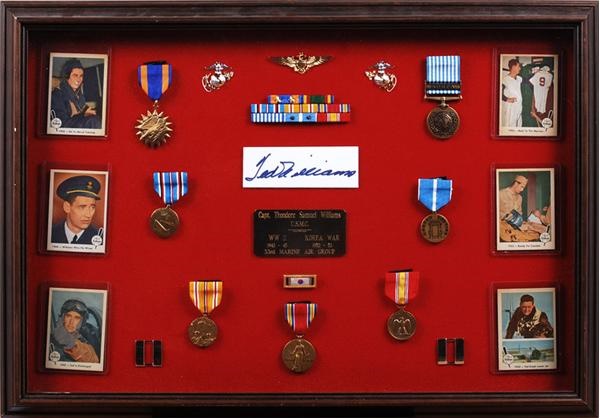 Beautifully framed presentation of USMC medals just like the ones Ted Williams wore on his chest in the Military. The medals date from World War II and the Korean War and have been tastefully arranged in this 27"x19" display. The array demonstrates the Splendid Splinter's incredible dedication to country as the seven years he devoted to the military were during the prime of his baseball career. Also in the display are 1959 Ted Williams Fleer cards from each of the years of his military service as well as his marine corp. uniform ribbons. There is also an autograph card signed by Williams in perfect blue ink. Semper Fi!