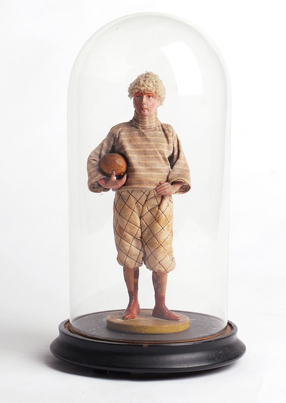 Nicely detailed hand carved wooden statue football's early days. Quilted 3/4 length pants with grey and tan striped turtle neck comprise the uniform. Blond colored wool as hair and detailed paint and carving complete the player’s head. Player is holding a football in right hand but needs a little glue to hold firmly in place. Statue stands on circular platform about 8" tall and includes a wooden base and bell shaped glass enclosure to protect it for many years of enjoyment. Very good condition.