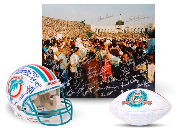 The 1972 Miami Dolphins had an unprecedented and yet to be duplicated 14-0 regular season en route to winning Superbowl VII and completing a perfect undefeated season. This is a 3 piece collection featuring a team signed (in blue marker) Riddell Helmet with over 40 autographs including Csonka, Greise and Shula. There are 3 signatures with a light smudge. There is also a signed white panel football with 25th Anniversary logo and over 35 signatures. The third element of the collection is a signed team photo. It is 16" x 20" with over 35 signatures numbered 36 out of 72.
