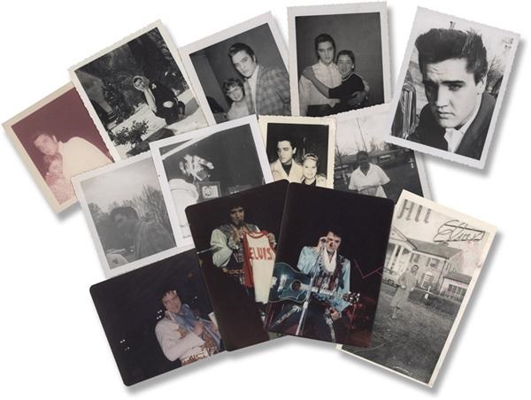 Astounding collection of (49) private, unpublished photographs of the great Elvis Presley. These photographs of the rock and roll icon originate from the albums of a family member. They include many color 3.5 x 5" photos from 1977 showing Elvis' last TV concert. Also, many great photos of Elvis, family and friends from the 1950's, including a nice shot of Johnny Cash posed with Elvis' cousin Patsy in 1959. Most of the photos, in their original plastic-sleeve album pages, are NM/MT although a small number are VG/EX due to the writing on the back bleeding though slightly or other spots on the image.