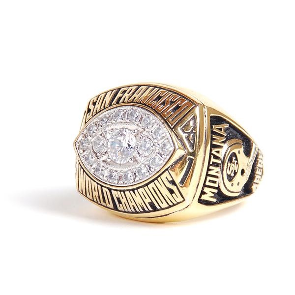 Faux diamonds in a football shape grace the top of this Super Bowl ring and are surrounded by engraved lettering that states, "San Francisco World Champions 1981". One shank is engraved with "Montana", a San Francisco helmet emblem and "49ers". The second shank is engraved with the Golden Gate Bridge, a football and "Super Bowl XVI 26-21". Non-gold, size 11 1/2. NM condition.