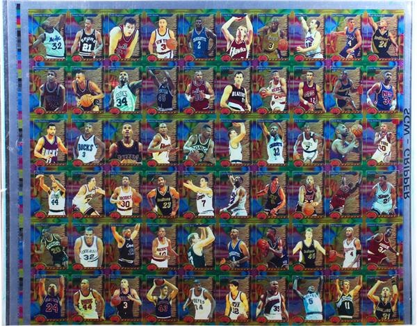 Uncut sheets of modern premium trading cards are scarce. This sheet has 60 cards including Micheal Jordan, Larry Bird, Olajuwon, Shaquille O'Neal and more. NM-MT.