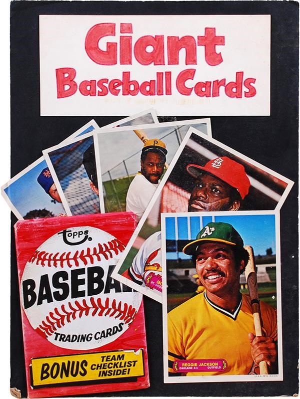 This is a really interesting piece. While trying to come up with a idea for a new type of card an enterprising Topps designer produced this 12 x 16.5'' display on board for "Giant Baseball Cards". Instead of going with the "Giants" theme, the design was used to create a set of puzzle cards in 1974. "Cards" pictured include Reggie Jackson, Bob Gibson, Willie Stargell, Tom Seaver and one other identified. One of a kind and significant.