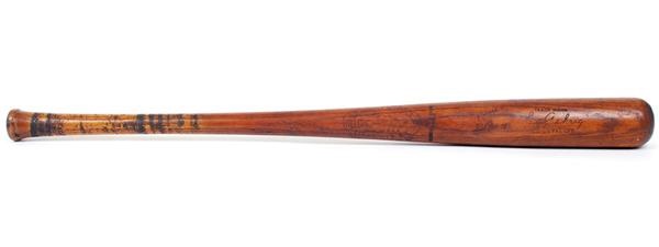 The number "33" is stamped into the knob to denote the inches of the bat. Model 40 L.G. There is some tape residue on the handle, and minor splitting in the grain on the back side. Somebody tried to forge Gehrig's signature on the barrel and even though it is somewhat faded, it is still visible. No cracks. Shows moderate wear.