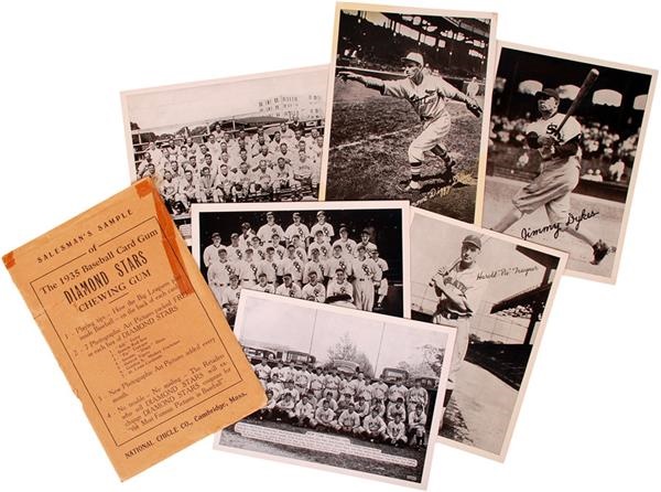 Set of six "Salesman's Sample 1935 Baseball Card Gum Diamond Stars Chewing Gum" cards with original "National Chicle Salesman's Sample Envelope". The set includes Pie Traynor, Jimmy Dykes, Dizzy Dean, a 1935 Yankees Team Photo, a 1935 White Sox Team Photo, and a 1935 Boston Red Sox Team Photo. The cards are all in mint condition. Envelope is VG with a tear, but rare in any condition.