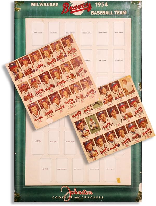 The Johnston Cookie Company of Milwaukee produced three sets (1953, 1954, 1955) of Milwaukee Braves cards. These cards were bundled as give aways in their Pops Cookies packages or by mail order. This is a complete set of Milwaukee Braves baseball cards from the 1954 season in two uncut sections with display poster. Display measures 23” x 35”. It features all 35 cards; two uncut sections of 18 (Warren Spahn is duplicated on one form). Included are HOFers Hank Aaron (as a rookie), Eddie Mathews and Warren Spahn. Each sheet has paper loss and tape residue on the corners as well as some corner creases. Overall VG, but is realatively easy to restore and has a excellent overall appearance.