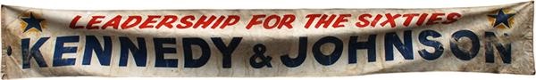 This circa 1960 JFK and Johnson campaign street banner encapsulates the country’s simmering desire for “new leadership” as stated on this canvas banner that measures 19’7”x2’10”. The banner is strung with rope and is doubled sided so that its message can be read from both sides, as we are sure it was when originally displayed across main street USA for pedestrians and motorists alike. The banner is in good condition with 3-3-4” sized holes and 1-1”hole. The paint of the lettering is cracking and wearing in some spots, primarily close to the ends, but is in overall good condition. This is a stunning piece of political Americana that marks a volatile yet exciting Era in U.S. history.