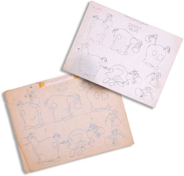 This is the original art (colored pencils on artist paper) from Paramount's Cartoon Studios, drawn as a guide for animators to create the Sparkplug cartoon. Also includes the “printed” character sheet from this Original Art. The animation holes on the original were to keep them all together (cells have identical holes). The original on artist's paper has some wear and toning around the edges as well as some spots along the top (including a large one on the right). It doesn't diminish this great piece of classic animation art.