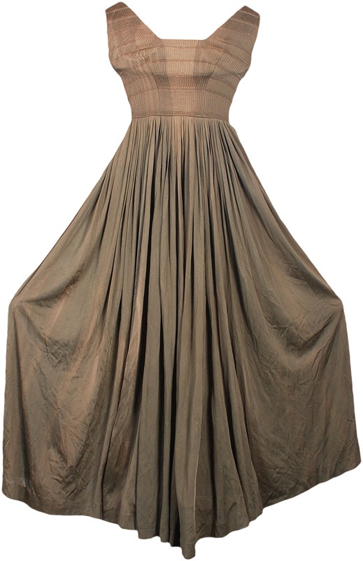 The 1963 epic film, Cleopatra, was (and still is) one of the costliest films ever made. After going 40 million dollars over budget, the films notoriety came not from its content, but from the scandalous affair between stars Elizabeth Taylor and Richard Burton. The part of that fortune spent on costuming paid off- it garnered the film an Oscar for Best Costume Design that year. Here is one of the gorgeous designs made for and worn by Elizabeth Taylor as Cleopatra. This sleeveless, empire waist, floor length gown is made of olive green silk and was custom made by Giuseppe Peruzzi of Casa d Arte Firenze. The costumer's tag is sewn inside the empire waist. Along the inside of the zipper is a tag with "Elisabeth Taylor" hand written in blue ball point. There is very light fading of the silk on the front of the bodice, but the dress remains a stunner and in NM/MT condition.