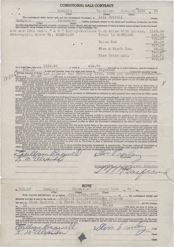 One page typed "Conditional Sale Contract" between a Harley Davidson Motorcycle dealer in Memphis, TN and Elvis Presley. Elvis purchased a 1956 Model "KH" for $1134. The contract is signed by Elvis in blue ballpoint. On close inspection, it is obvious that the pen he was using ran out of ink and he had to sign his name again over the existing light signature. Three vertical fold lines, a few small staple holes and a 1'' tear (repaired with tape) near the bottom border are typical on a document of this ilk. It is notable that this contract is dated 4 days after Elvis recorded "Heartbreak Hotel" for his new, major label. The Harley was obviously a present to himself for a job well done and to celebrate the prospects of a bright future.