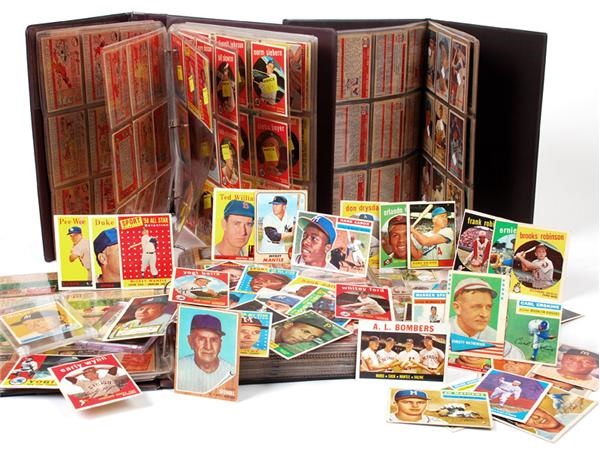 Typical childhood card collection with a concentration in the 1955-1959 era. Better cards includes 1956: Aaron, Spahn, Mathews, Hodges, Ashburn. 1957: Howard, Mathews, Spahn. 1958: Reese, Mantle, Snider, Berra, Mantle AS, Mathews, Aaron, Aaron AS, Williams. 1959: Berra, Ford, B. Robinson, F. Robinson, Wynn, Aaron, Drysdale, Cepeda and more. There are a number of other star, high numbers, and special cards. About 95% topps with the remaining 5% being Bowman, Fleer and a few odds and ends from the 1960's-1980's. Condition is about what you would expect with a well handled collection, with about 10% EX-MT, 30% VG-EX and 60% VG or less.
