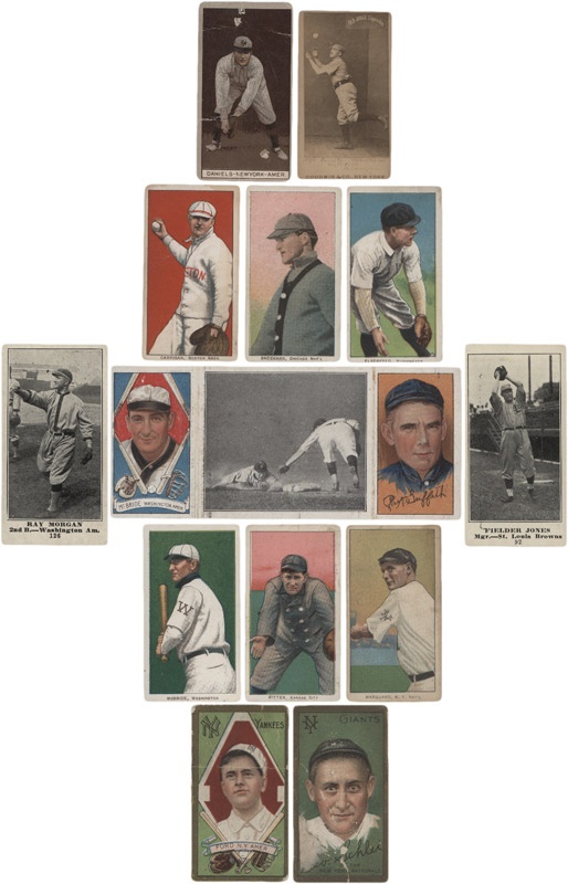 Great lot of early tobacco cards with variety, but also a large concentration of T206's, the king of all tobacco card sets. Includes N172 Old Judge: Pfeffer of Chicago (EX/EX+) and Fogarty script variety (VG-EX, former owners name stamped on back). T205: (11) different including Jimmy Collins, Bender, Marquard, Wheat and more. All grade poor. T206: (135) different including Young Port (Old Mill, VG/VG+), Willis w/ bat (Polar Bear, VG), G. Davis (VG+), Bresnahan w/ bat (VG), Wheat (Tolstoi, VG), Waddell Port (Sovereign 350, VG), Collins Port (Cycle 350, VG), McGraw w/ sweater (VG), McGinnity (Poor), Marquard Pitch (Cycle 460, VG), Jennings (VG/VG+), Crawford (Polar Bear, Good), as well as Chase (3 different), Donlin, Rucker, Elberfield, Carrigan, Blackburne, Davis, Oldring, etc. There are some minor leaguers, but no Southern League. Some better backs, but nothing too scarce. Grades 10% P/G, 80% VG, 10% VG-EX. T202: The Athletic Infield w/ Thomas and Karuse (VG-EX), Schaefer Steals Second w/ Clark Griffith and McBride (VG). T207: Daniels (P), Max Carey (P), Chalmers (VG). M101-4 Sporting Life: #126 Morgan (EX-MT) and #92 Jones (EX-MT).