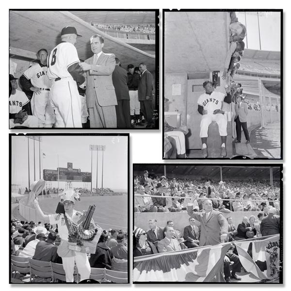 The 42,269 fans who attended the inaugural game at Candlestick Park were treated to a 3-1Giants win. Images include: Richard Nixon shaking hands with Willie Mays (great image!), fans, vendors with souvenirs, Richard Nixon's 1st pitch, Nixon with other players, visiting Cardinals players, Sam Jones pre-game and post-game (he won the game), Mays signing autographs, views of the stadium interior, fans arriving, Horace Stoneham, Warren Giles, and more. Also, a handful of negatives from the first night game played a few days later are included here, but not in the above count. Sizes range from 35mm to 4 x 5’’ with most measuring 4 x 5’’. Mint.