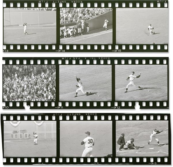 Classic images from Game 6 of the 1962 World Series. The Yankees and the Giants battled it out on Oct 15th, 1962, at Candlestick Park. All are black and white, 35mm negatives. Pictured are Willie Mays, Orlando Cepeda, Alou, Kuenn, Tresh, Kubek and more. Housed in their original envelope. Mint.