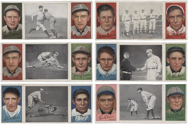 Includes The Athletic Infield (Graham, Three Fingers Brown, VG), Evers Makes a Safe Slide (John Evers, Archer, VG-EX), Just Before the Battle (Devore, Becker, VG), Chase Guarding First (Fred Clarke, Gibson, VG-EX), Chance Beats Out a Hit (Archer, Overall, EX), and Too Late for Devlin (Meyers, Ames, VG). Always popular cards.