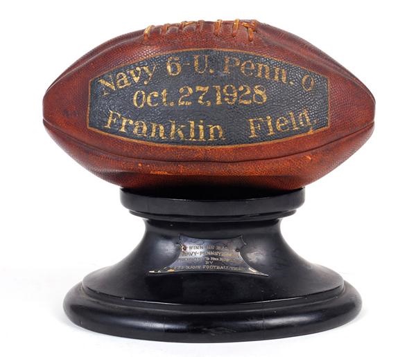 Navy defeated Penn by a score of 6 to 0 in their 1928 gridiron match-up. This trophy football is a relic of that game with the winning details spelled out in EX-MT gold paint on a blue background. It reads, “Navy 6 - U. Penn. 0 Oct. 27, 1928 Franklin Field”. The panel opposite the inscription has faint writing that says, “Fullback Joe Canton”. The former owner contacted Navy Archivists about the ball, which comes with its original, black lacquered base, inscribed to a Mrs. Robison. The Navy had no information about the woman, except that Rear Admiral Samuel S. Robison was Superintendent of the Naval Academy at that time. That response letter from the Department of the Navy is included with the trophy ball.