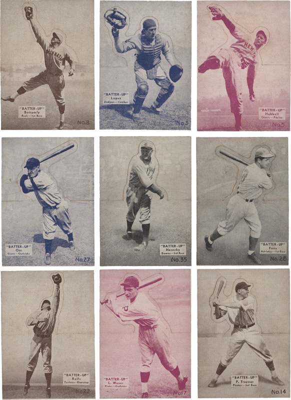 Near set of low number cards, 69 of 80. This series is absolutely loaded with Hall of Famers. Some better cards include: #5 Hubbell (VG-EX), #7 Martin (VG/VG+), #8 Bottomley (VG-EX), #14 Traynor (VG-EX), #17 Lloyd Waner (EX), #27 Ott (VG), #28 Foxx (VG-EX), #35 Hornsby (VG-EX), #36 Lyons (VG), #37 Marranville (EX), #57 Greenberg (VG/VG+), #65 Dean (EX). The missing numbers are: 32, 42, 43, 46, 53, 54, 55, 59, 69, 70, 76. The best part is that only a few of them have ever been "punched". Most of the cards in the set are VG to VG-EX with a few better and a few worse.