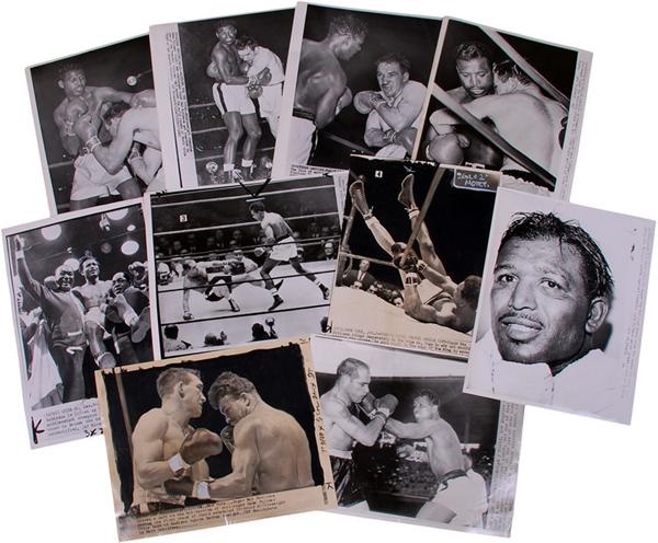 A huge collection of action packed news wire photos ranging in date from 1951 through 1961. The photos range in size from 14"X11"1/4 to 17" X 121/4". Many include type print affixed to photos describing fight scenes. Original newspaper clippings affixed to verso of some. Most in near mint condition with a few tears and creases on some but overall an amazing collection.