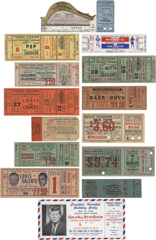 Here are (20) spectacularly well preserved tickets. The events which these tickets would gain you entry into include some of the most notable of the 20th century. The collection includes: JFK’s birthday party held at Madison Square Garden in 1962. That gala event provided us with one of history’s most memorable renditions of “Happy Birthday” thanks to a sultry Marilyn Monroe. (NRMT with slight crease in middle), 1939 Heavyweight Championship bout between Louis & Galento (MT), 1976 Madison Square Garden Heavyweight Championship bout between Ali and Norton (MT),1950 Middleweight Heavyweight Championship bout between LaMotta & Graziano where Graziano was a no-show (MT),1950 Heavyweight Championship bout between Joe Louis & Ezzard Charles (MT), 1939 Yankee Stadium bout between Baer & Nova (MT), 1951 Yankee Stadium bout between LaMotta & Murphy (MT), 1930 Polo Grounds bout between “Kid” Chocolate & Jackie “Kid” Berg (MT), 1935 Bronx NY Charity Boxing Carnival in gilt paperboard with ornate gold embossed seal for the NY State Athletic Commission (MT), 1973 MSG live telecast of Ali vs Norton (MT), NY Giants football 1941 complete season ticket book (MT),1938 Jai Alai at the NY Hippodrome full ticket with interesting die cut design and color printing (MT)