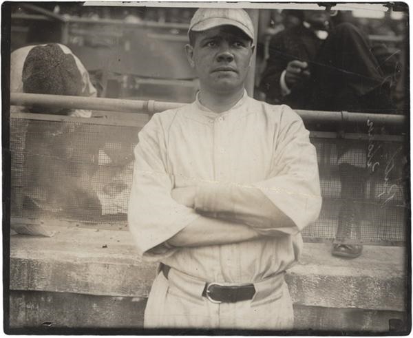 4 x 5'' vintage photo produced from a glass plate negative of young Babe Ruth as a member of the Boston Red Sox circa 1918. The photo was taken at Fenway Park by the noted studio of Underwood and Underwood (stamped on verso). A few light surface creases, one of which extends horizontal from the left to right edge are the only flaws. Excellent overall appearance.