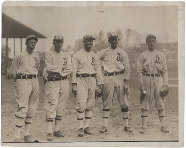 Vintage 8 x 10'' photograph by the noted studio of Underwood and Underwood. Pictured are A's infielders Eddie Collins, Jack Berry, Danny Murphy, Frank Baker and Stuffy McInnis. Photo was taken before the October 10th game at Shibe Park as noted on the attached caption sheet. Excellent condition.