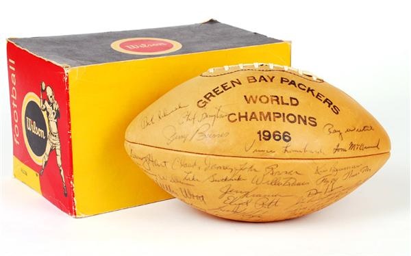 Ball is a "Green Bay Packers World Champions 1966" model but was signed by the Super Bowl Champions of the 1967-68 season. Complete team with Lombardi, Wood, Davis, Gregg, Starr, Thurston, Kramer, Pitt, Nitsche, Adderley, Jordan, and more. 38 total signatures. Ball is EX-MT+ while signatures grade 8/10.