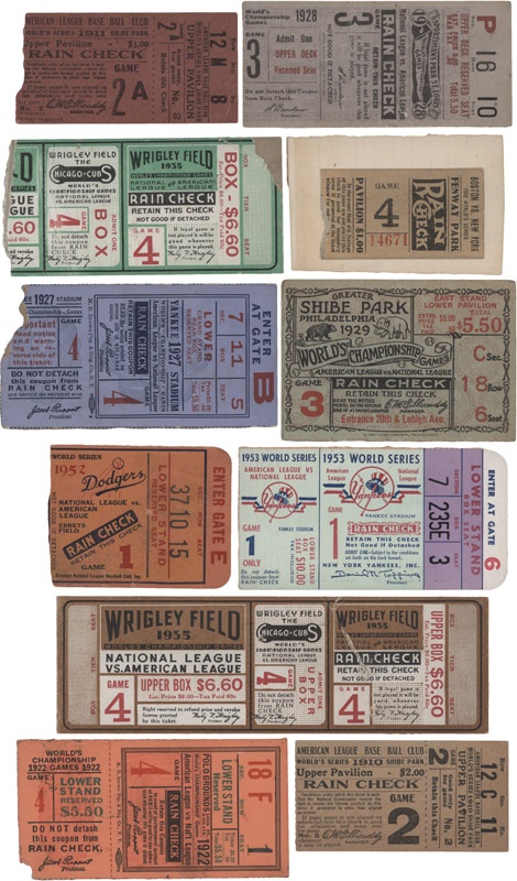 Incredible collection of World Series Tickets (59) including a number of early stubs and significant games. Includes 1910 Game 2 in Philadelphia, 1911 game 2A in Philadelphia, 1912 Game 4 in Boston (affixed to scrapbook page), 1922 Game 4, 1923 Game 2 (Ruth 2 HR's), 1923 Game 5, 1927 Game 4 (Ruth HR), 1928 Game 3 (Gehrig 2 HR's), 1929 Game 3, 1930 Game 1(Cochrane, Simmons HR), 1930 Game 4, 1931 Game 2, 1933 Game 1 (Ott HR), 1934 Game 4, 1935 Full Proofs (2), 1935 Game 1, 1935 Game 4, 1936 Game 6 (Ott HR), 1938 Game 3, 1939 Game 1, 1939 Game 2, 1940 Game 2, 1942 Game 4, 1943 Game 1, 1947 Game 6, 1948 Game 1, 1948 Game 3, 1951 Game 4 (Dimaggio HR), 1952 Game 1 (Robinson, Reese, Snider HR's), 1953 Game 1, 1955 Game 6, 1956 Game 6, 1957 Game 5, 1958 Game 4, 1958 Game 7, 1959 Game 2, 1959 Game 5, 1960 Game 7 (Mazersoski Famous HR), 1964 Game 3 (Mantle HR), 1964 Game 6 (Mantle, Maris HR), 1964 Game 7 (Mantle HR), 1965 Game 2, 1965 Game 5, 1965 Game 6, 1965 Game 7, 1967 Game 2 (Yaz 2 HR's), 1967 Game 4, 1967 Game 7 (Gibson HR), 1968 Game 1, 1962 Game 2, 1968 Game 6, 1970 Game 1-5 and 1971 Game 3 (2). Conditions vary from G-VG to Excellent with most VG or better.