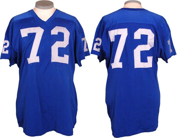 All original with "72" on front, back and both sleeves. Both sleeves have been shortened. Griswold size 50 tagging in the tail. Nice use with some team repairs.