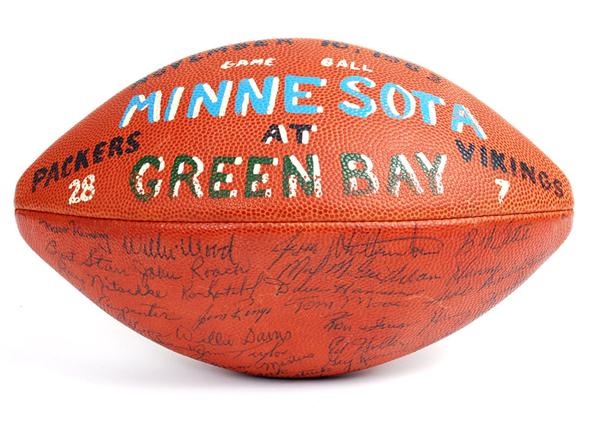 This game ball was given to Forrest Gregg and came from his personal collection. Dated November 10, 1963 from the game vs. Minnesota. A game in which the Packers beat the Vikings 28 to 7. Official NFL Duke Ball by Wilson (Pete Rozelle) shows use but is still EX-MT. Signed by the entire team (no Lombardi). Signatures in black are 9/10. Starr, Wood, Adderley, Jordan, Nitschke, Ringo, Carpenter, Taylor, Kramer and the rest are here. LOA included.