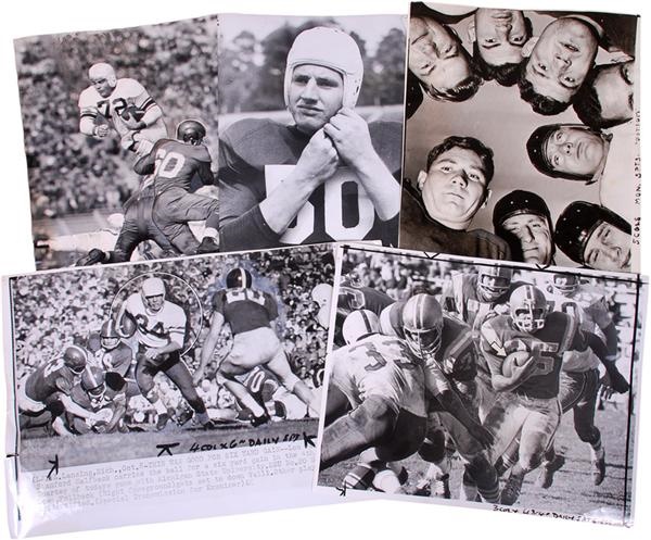 A collection of NFL photos (300+) from the 1950's to the 1980's. Many have been taken by staff photographers at the San Francisco Examiner, making them one of a kind. Some include original news clipping attached to the verso. Others in the collection are wire photos with their typed caption sheets affixed to the photos. Many action shots here with editor enhancements accenting the photos. Groups include the San Francisco 49ers ranging from the 1950's through to the 1980's, as well as Leo Nomellini. Most are oversized measuring 11" X 14". Overall the collection is in excellent condition.